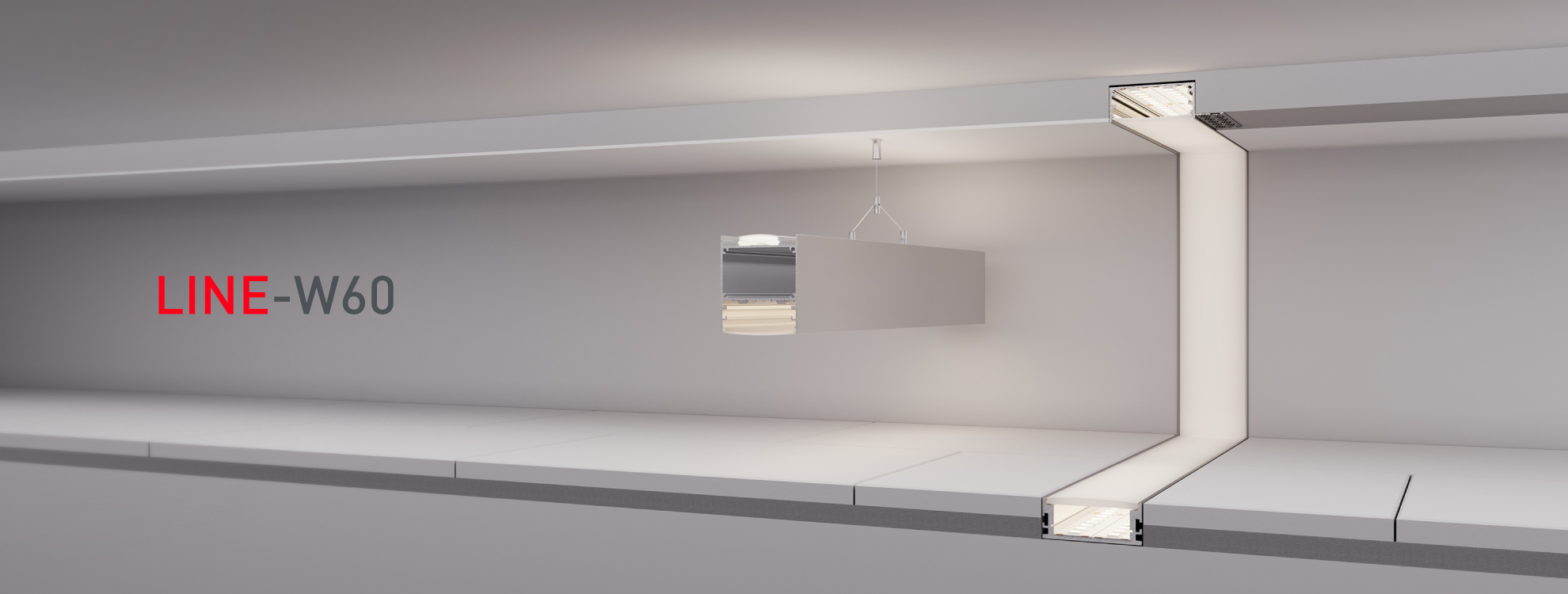 Серия профилей W60 предназначена для создания единой линии света «пол — стена — потолок». Ширина световой линии составляет 55 мм, что отлично подходит как для создания основного, так и декоративного контурного освещения.