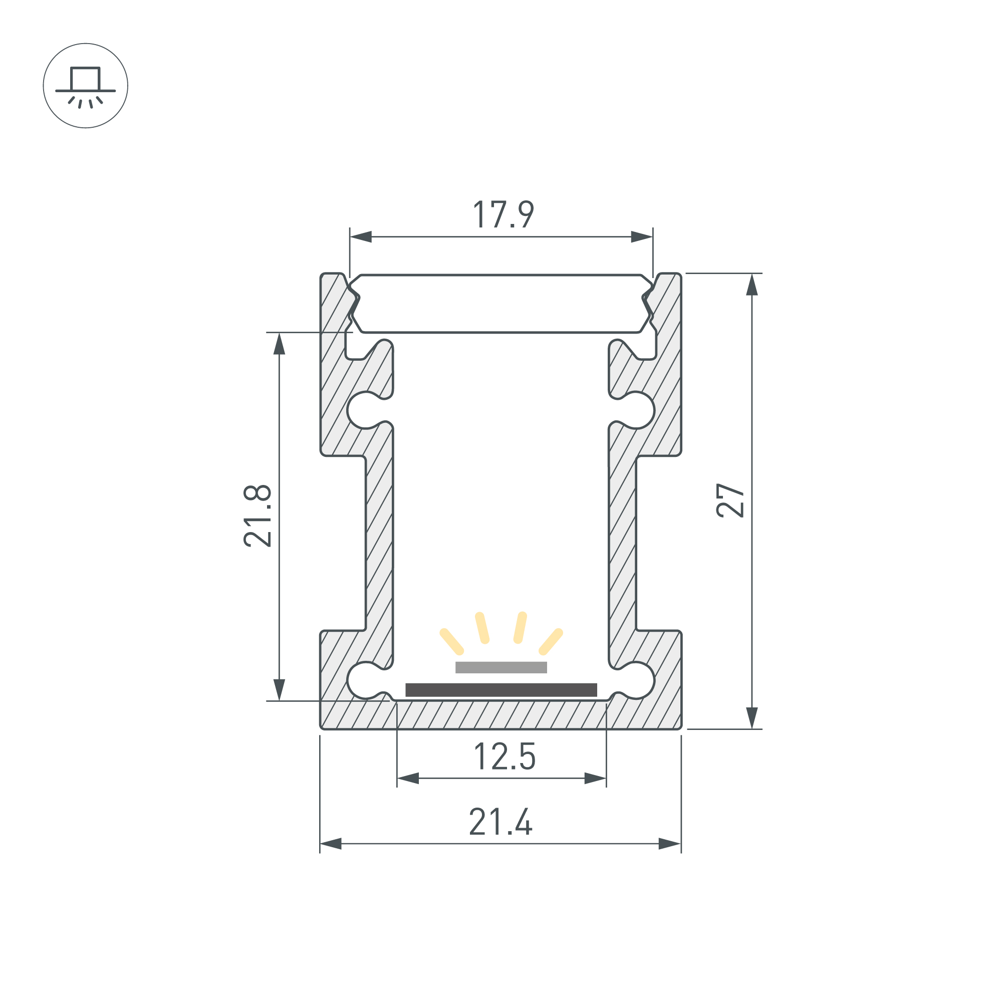 Габаритные размеры профиля составляют 2000 мм в длину, 21,4 мм в ширину и 27 мм в высоту. Площадка для установки светодиодных лент позволяет использовать ленту шириной до 12,5 мм и мощностью до 25,2 Вт/м. Это обеспечивает гибкость в выборе светодиодных лент и создает потрясающие световые решения.
