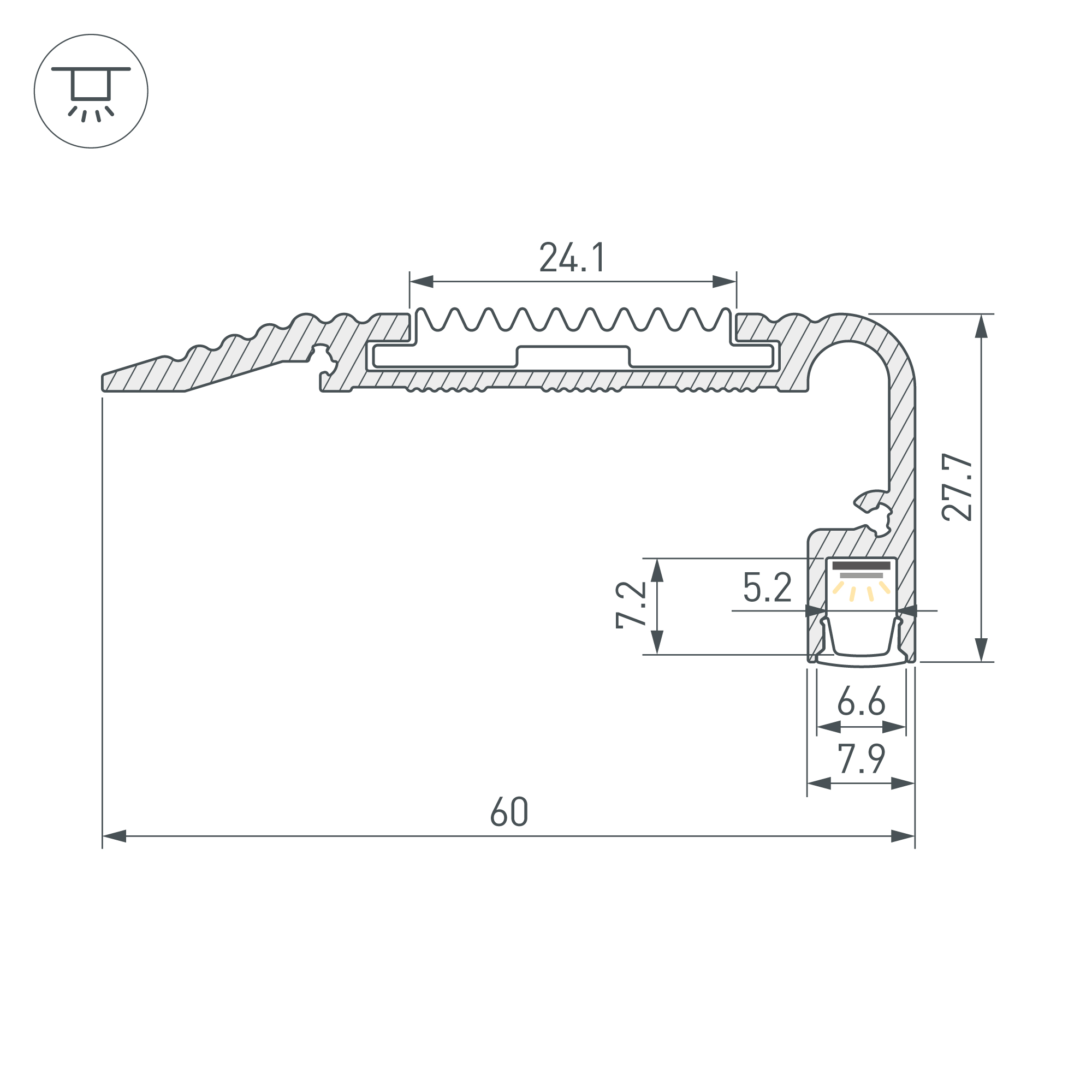 Накладной профиль из анодированного алюминия серебристого цвета для подсветки ступеней с антискользящей вставкой шириной 24,1 мм. Габаритные размеры профиля составляют 2000 мм в длину, 60 мм в ширину и 27,7 мм в высоту. Площадка для установки светодиодных лент позволяет использовать ленту шириной до 5,2 мм и мощностью до 31,5 Вт/м. Антискользящая вставка идет в комплекте с профилем. Экраны и заглушки не включены в комплект и приобретаются отдельно. Цена указана за 1 метр профиля. Отличное решение для создания современных световых проектов.