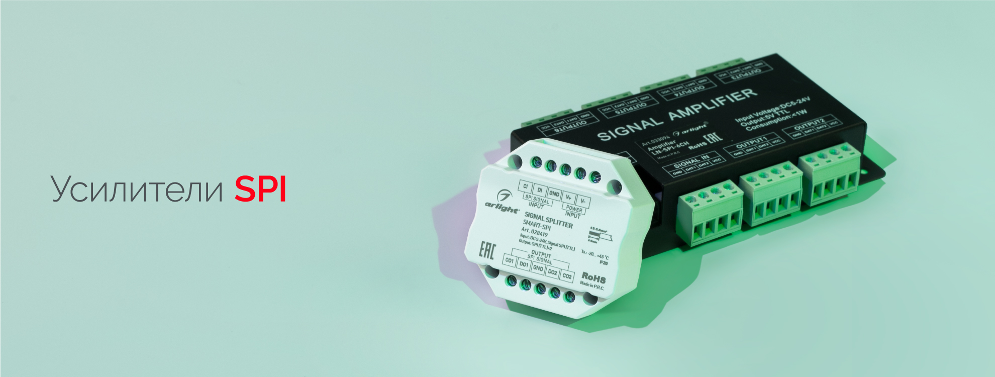 Усилители предназначены для усиления и разветвления сигнала управления светодиодных лент «бегущий огонь» или модулей, использующих протокол SPI.