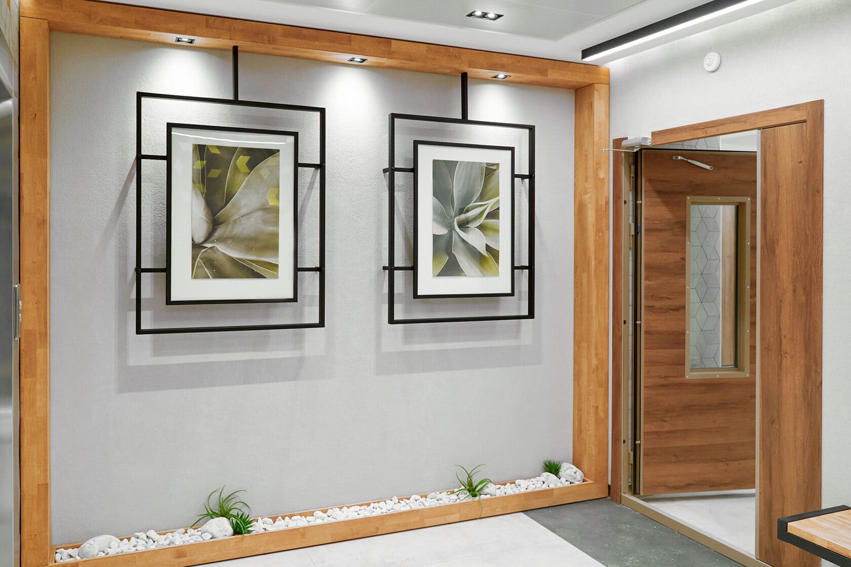За эстетику на этажах отвечают картины, акцент на которых делается с помощью встраиваемых светильников CL SIMPLE. Карданный механизм позволяет направлять световой поток в нужную сторону, а узкий угол излучения образует акцентное световое пятно на картине. Высокий индекс цветопередачи (CRI>90) обеспечивает восприятие цветов практически как при естественном солнечном свете.